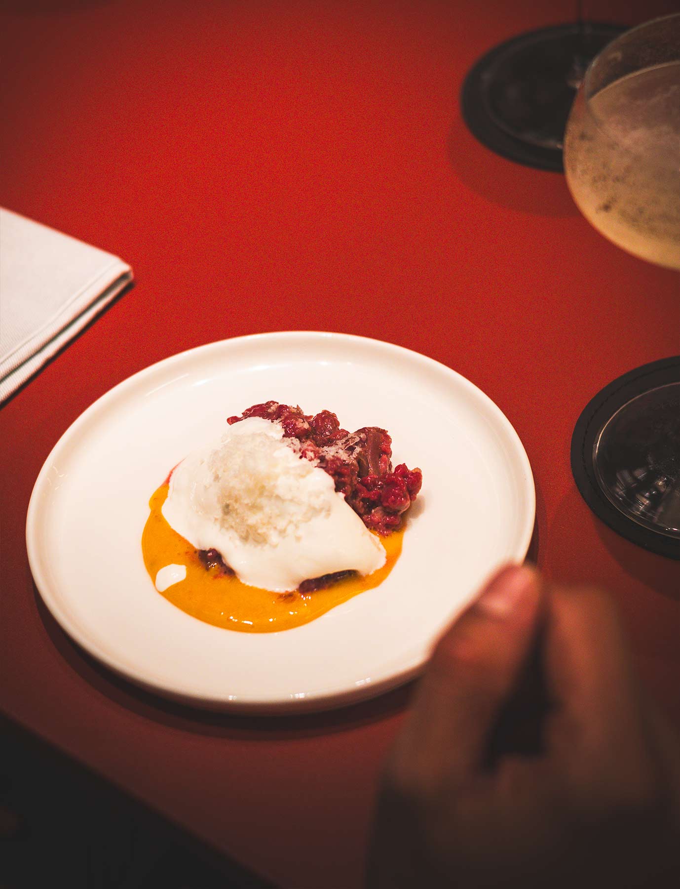 Tartare di asino con tuorlo affumicato, scalogno marinato e Provola delle Madonie
