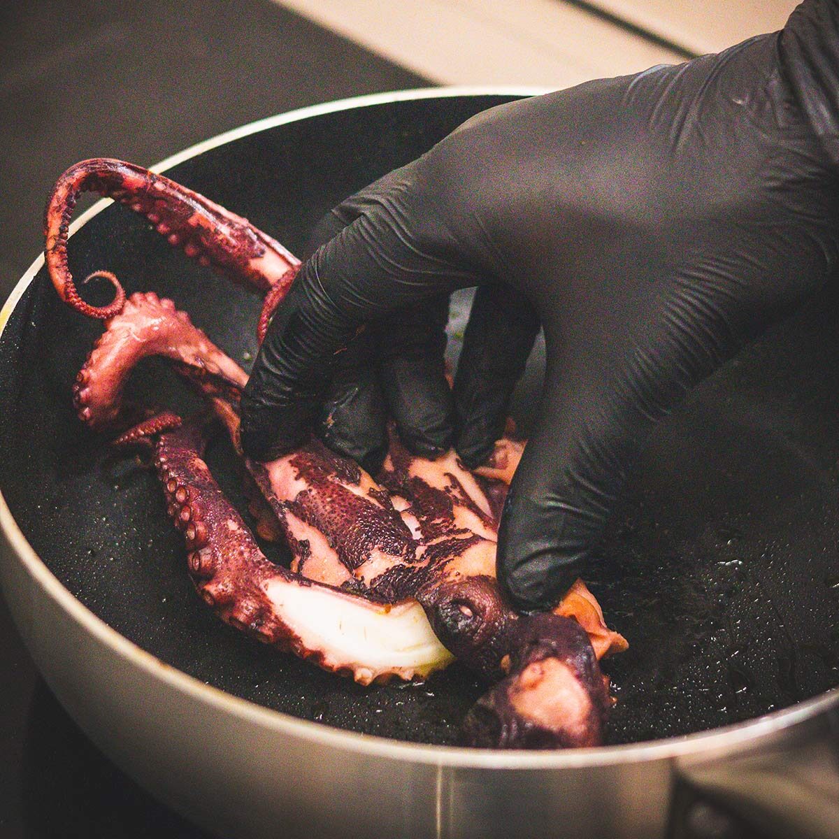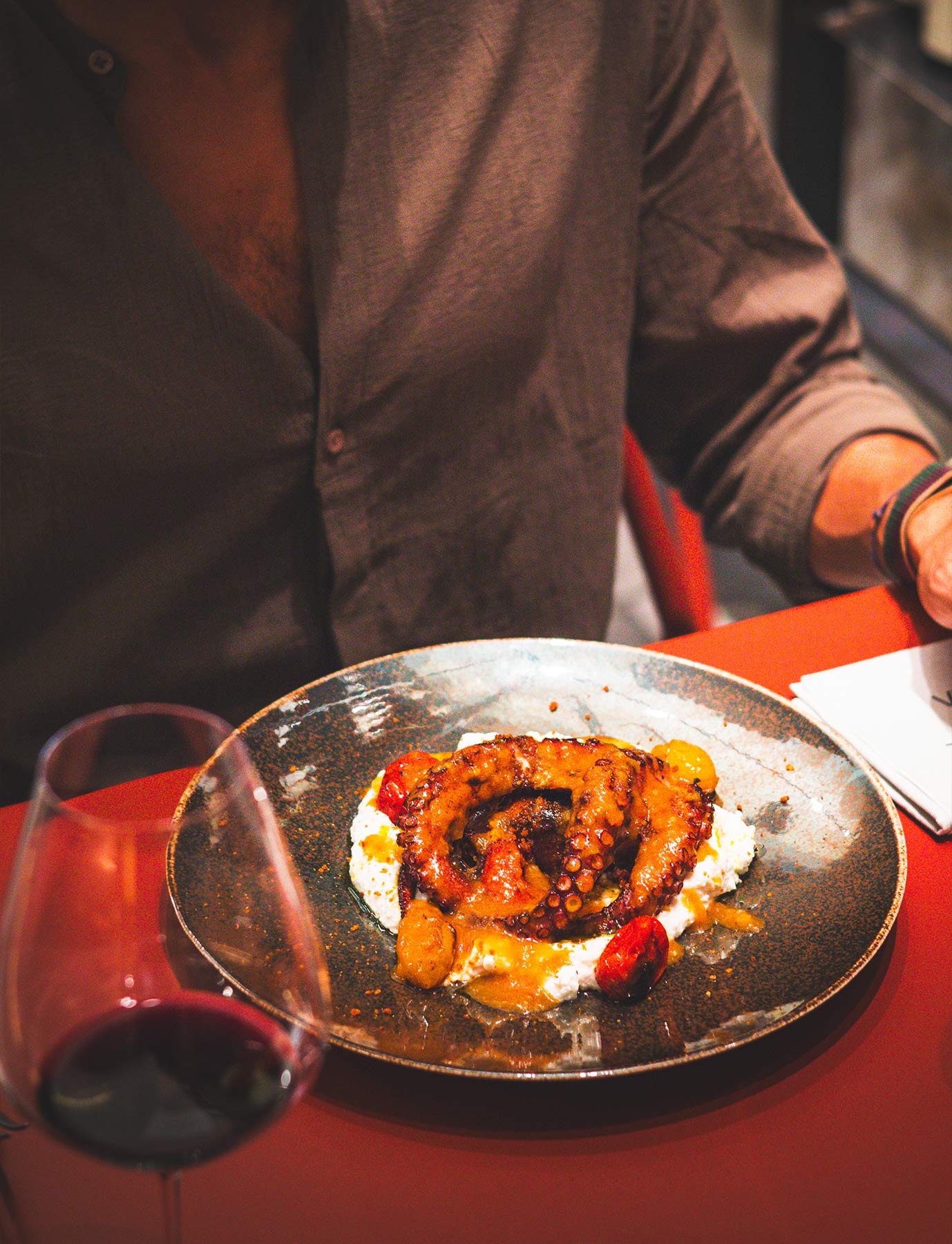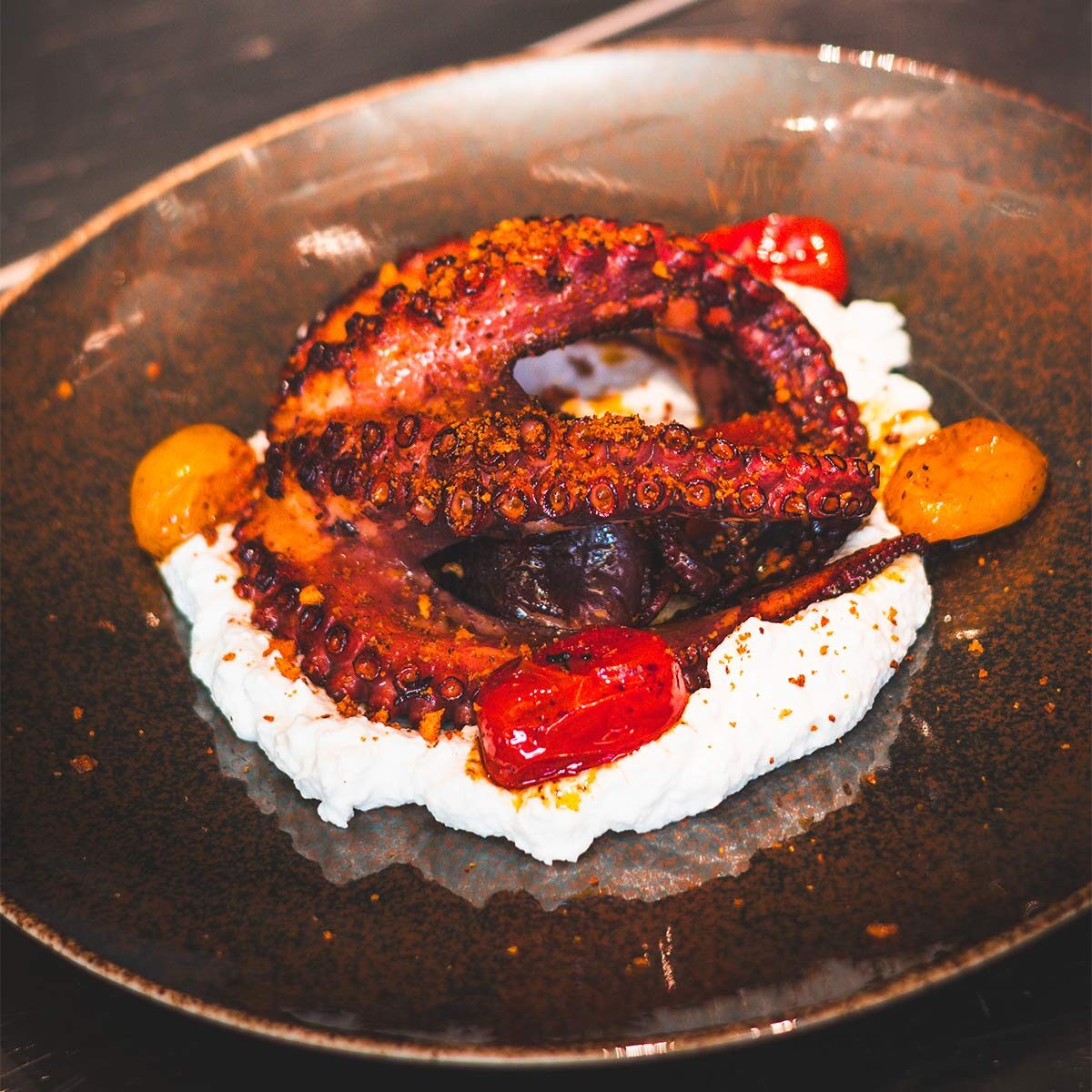 Polpo arrosto*, ricotta, pomodorino confit piccante e pane croccante