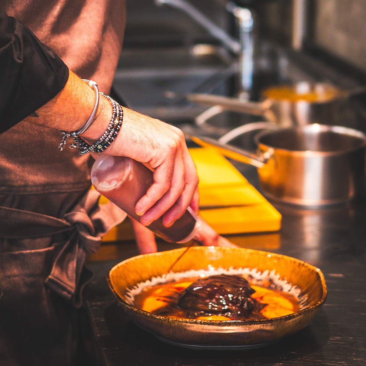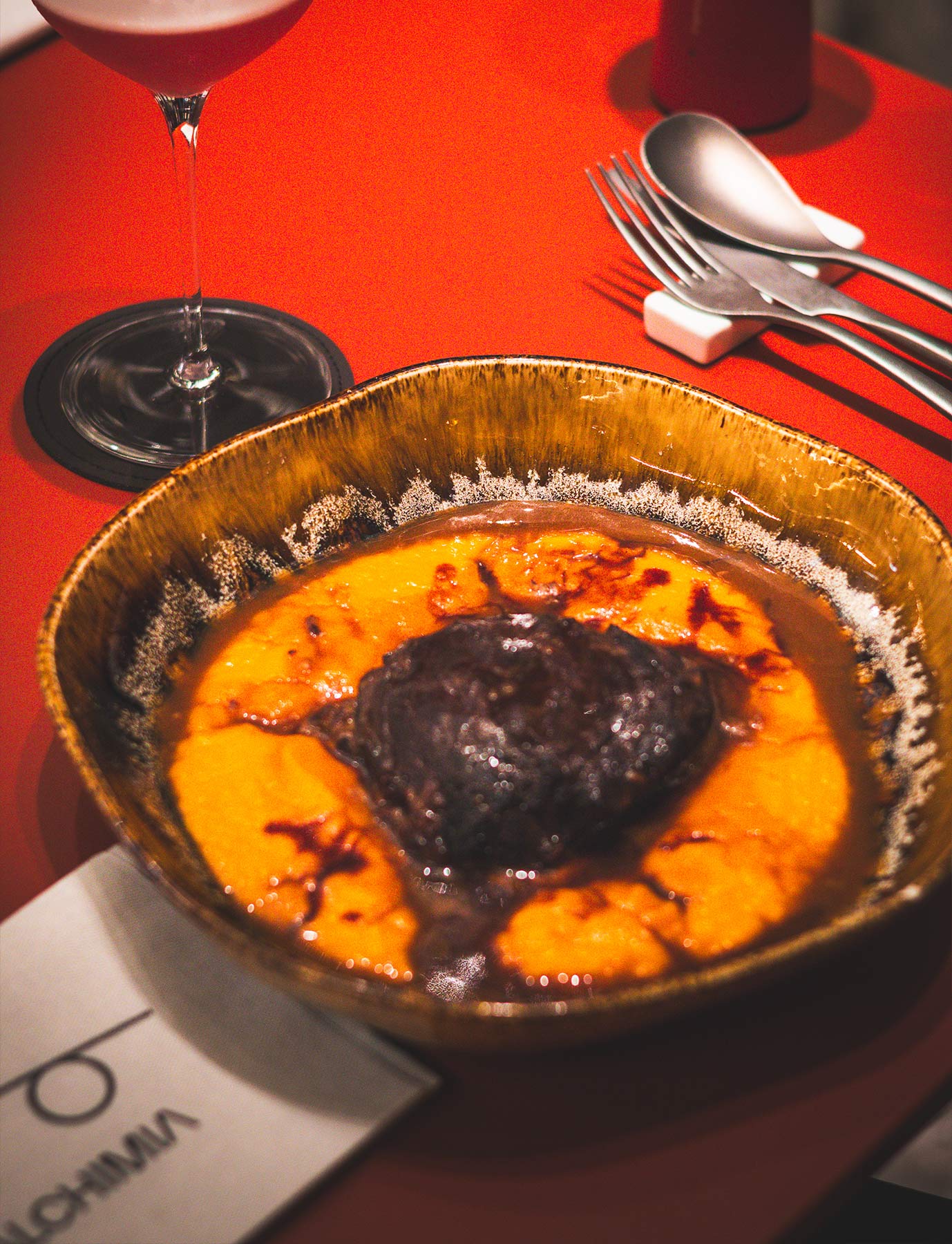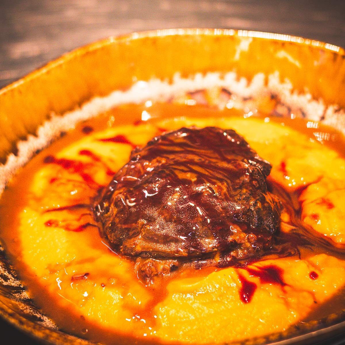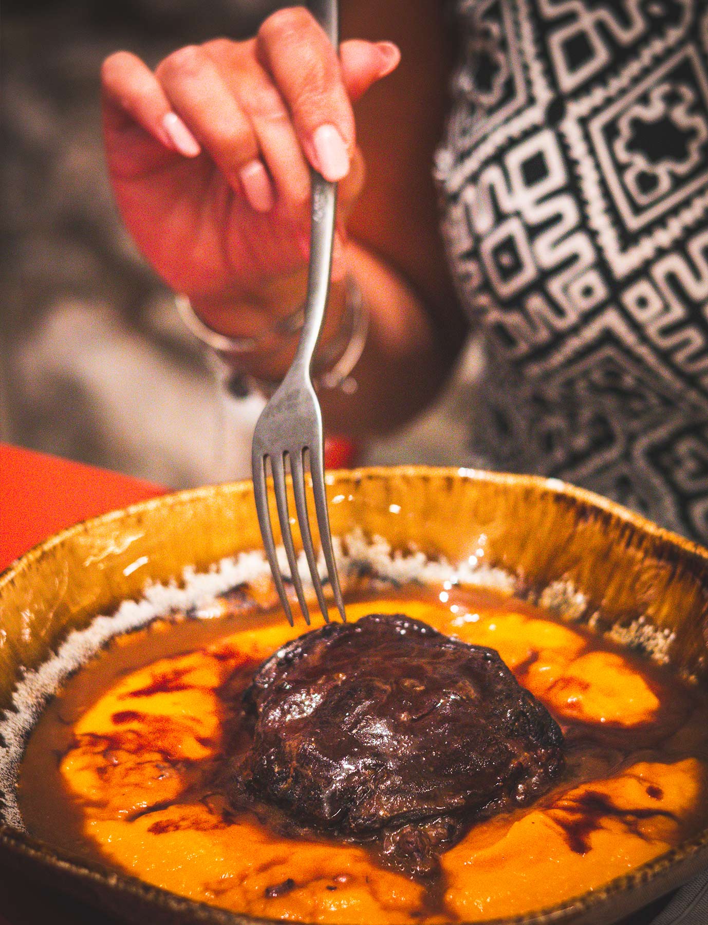 Guancia di manzo cotta lentamente, servita con fondo bruno al Nero d’Avola e cremoso di patata dolce