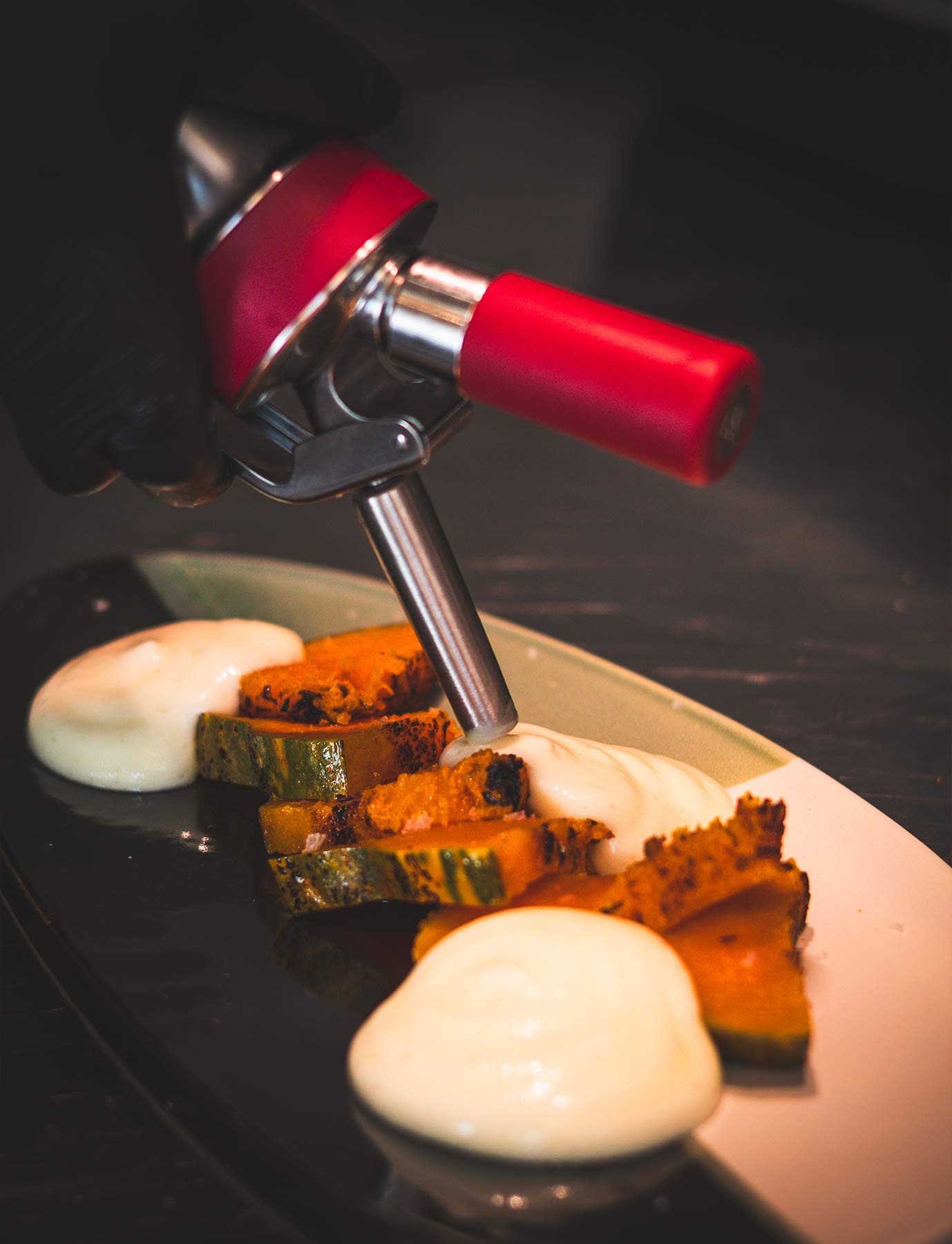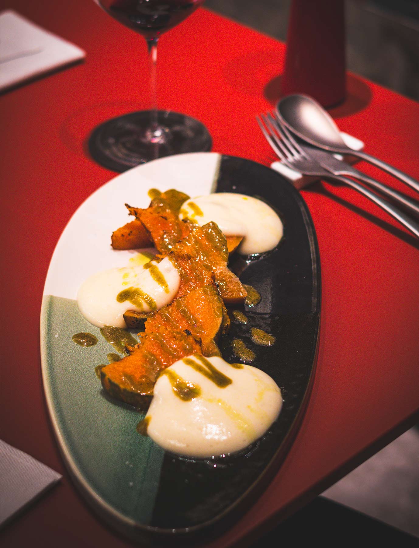 Bistecca di zucca e chimichurri siciliana servita con spuma di patata affumicata