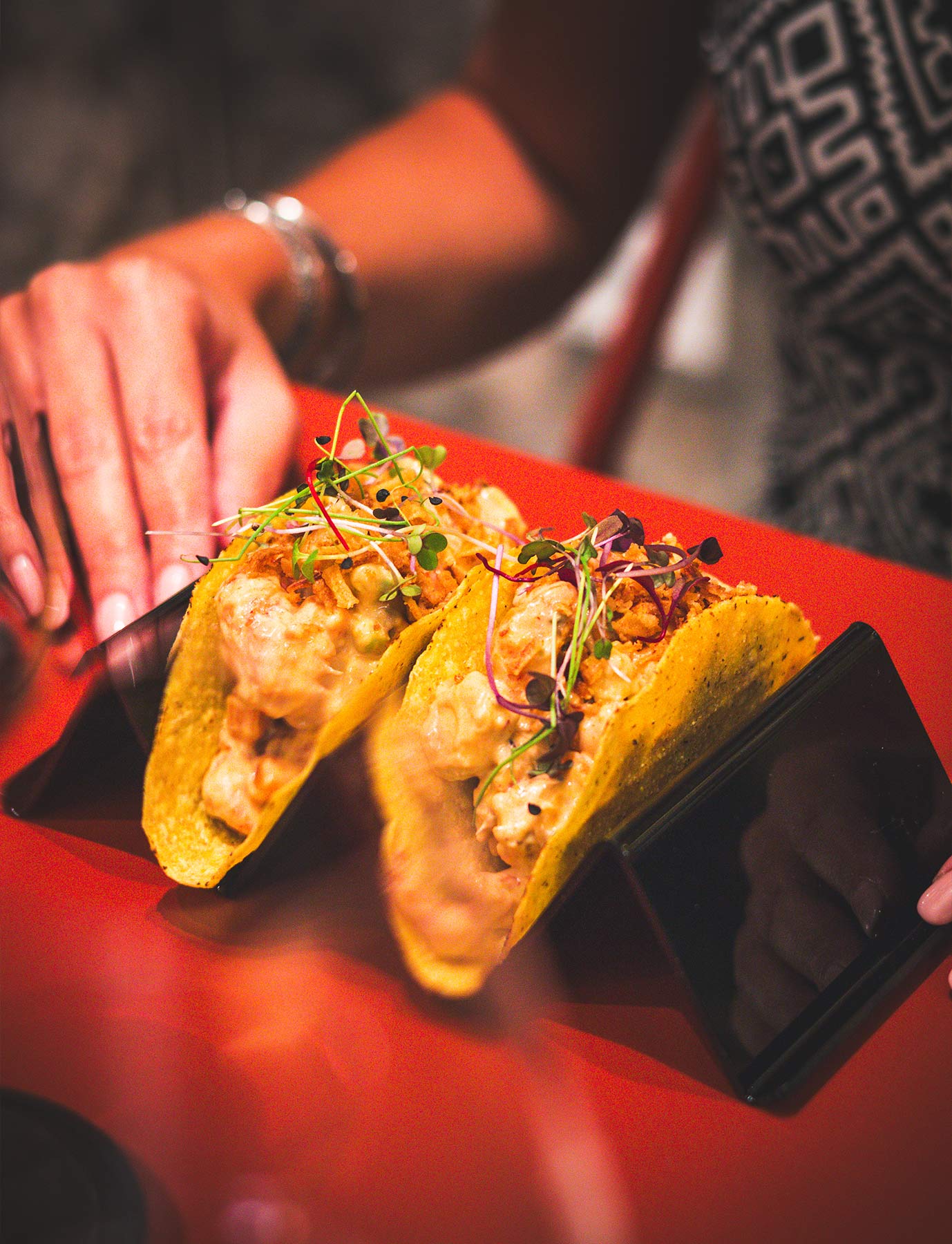 Tacos (2 pz) di mais ripieno con gamberi scottati, avocado, maionese al chipotle, patate e fiocchi di cipolla